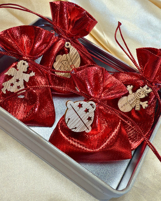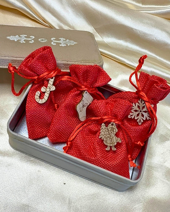 Ogni Scrigno è custodito in una raffinata scatola in latta artigianale e contiene 4 sacchettini con soggetti natalizi diversi, da aprire nelle quattro settimane che precedono il 25 dicembre.