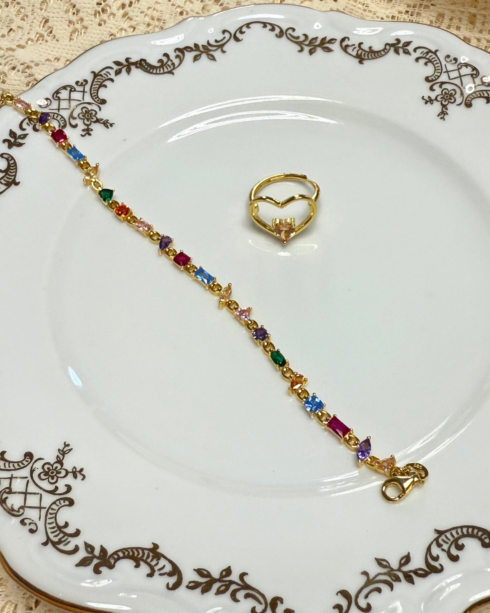 Scrigno composto da Bracciale in argento 925 dorato con pietre incastonate multicolor e Anello regolabile in argento 925 dorato con cuore centrale e zircone