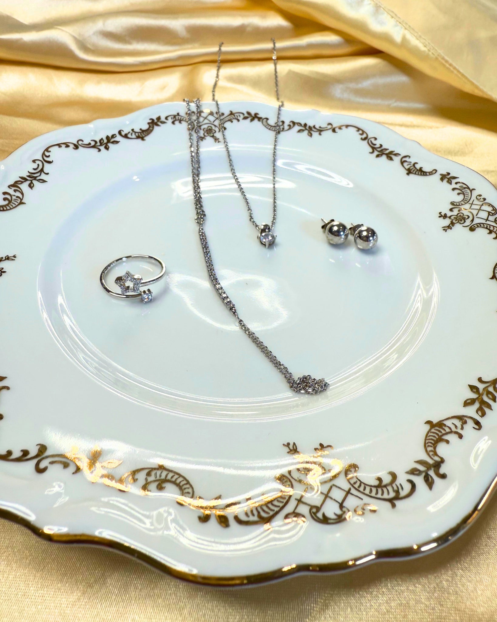 Collana punto luce, orecchni sfera a lobo, baciamano con zirconi e Anello con zirconi e stella. Gioielli in argento 925. Brilla con Cagnani Oreficeria